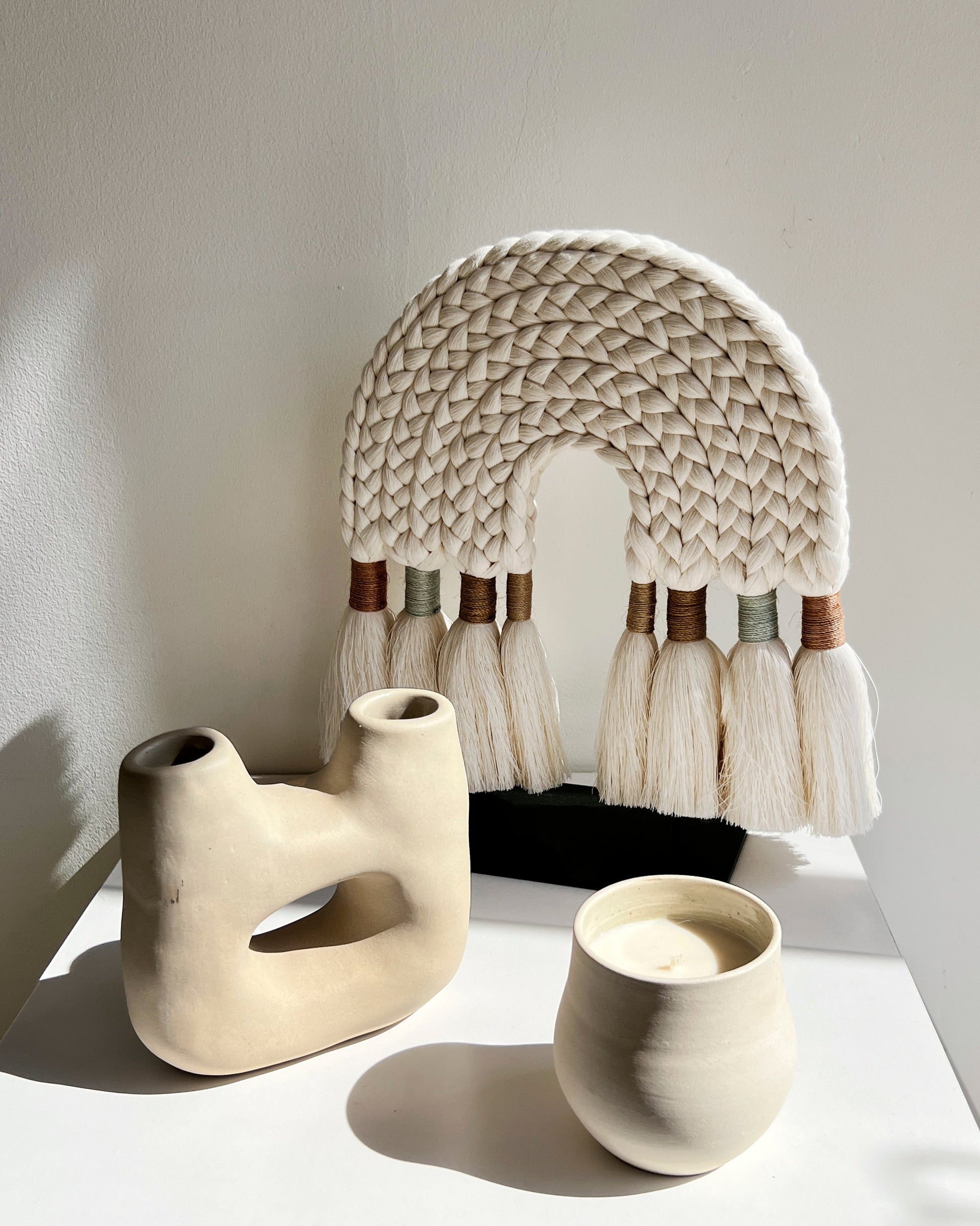 A bright scented candle to elevate your space. These costal handmade scented candles are perfect on your nightstand by your bed or on your coffee table in the living room. Their organic modern handmade clay vessels go perfectly in a boho, Palm Springs, or Joshua Tree desert decor.