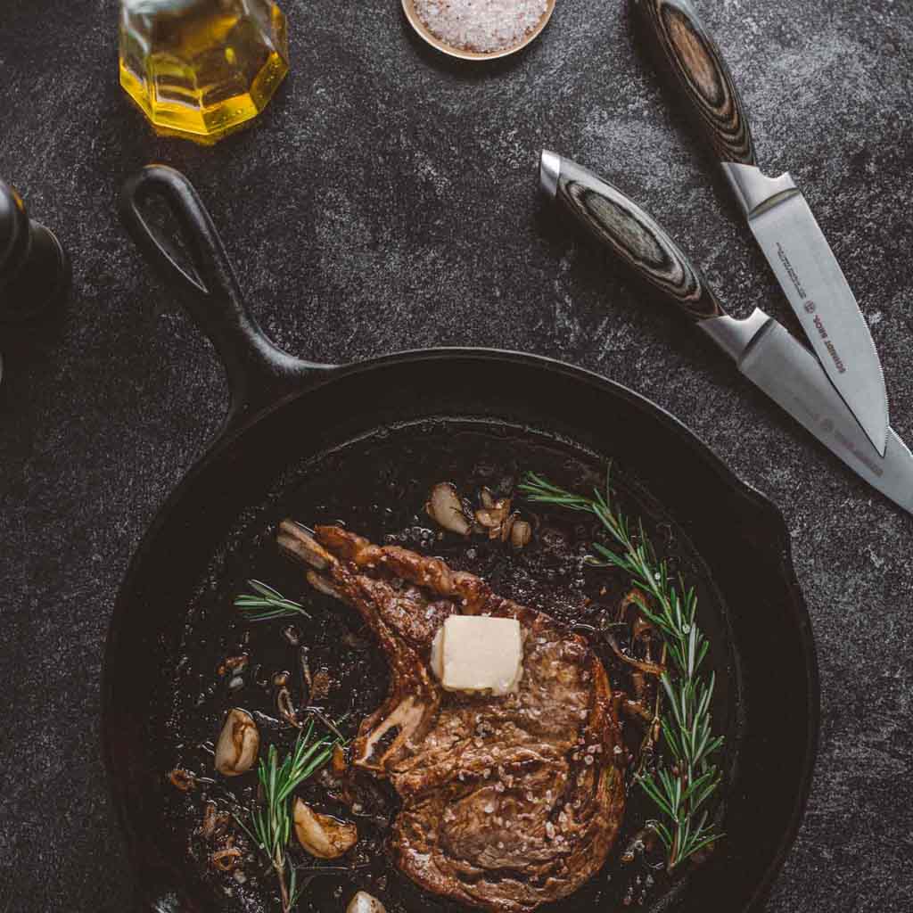 We call this exquisite steak set Bonded Ash because the 100% German stainless steel blades and the Ash Pakkawood handles were designed to be in perfect harmony, giving you a precise and pleasurable cutting experience (as if steak wasn’t pleasurable enough already).