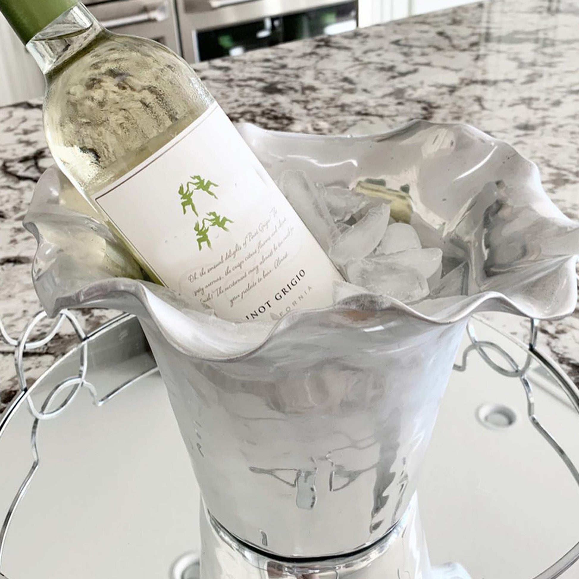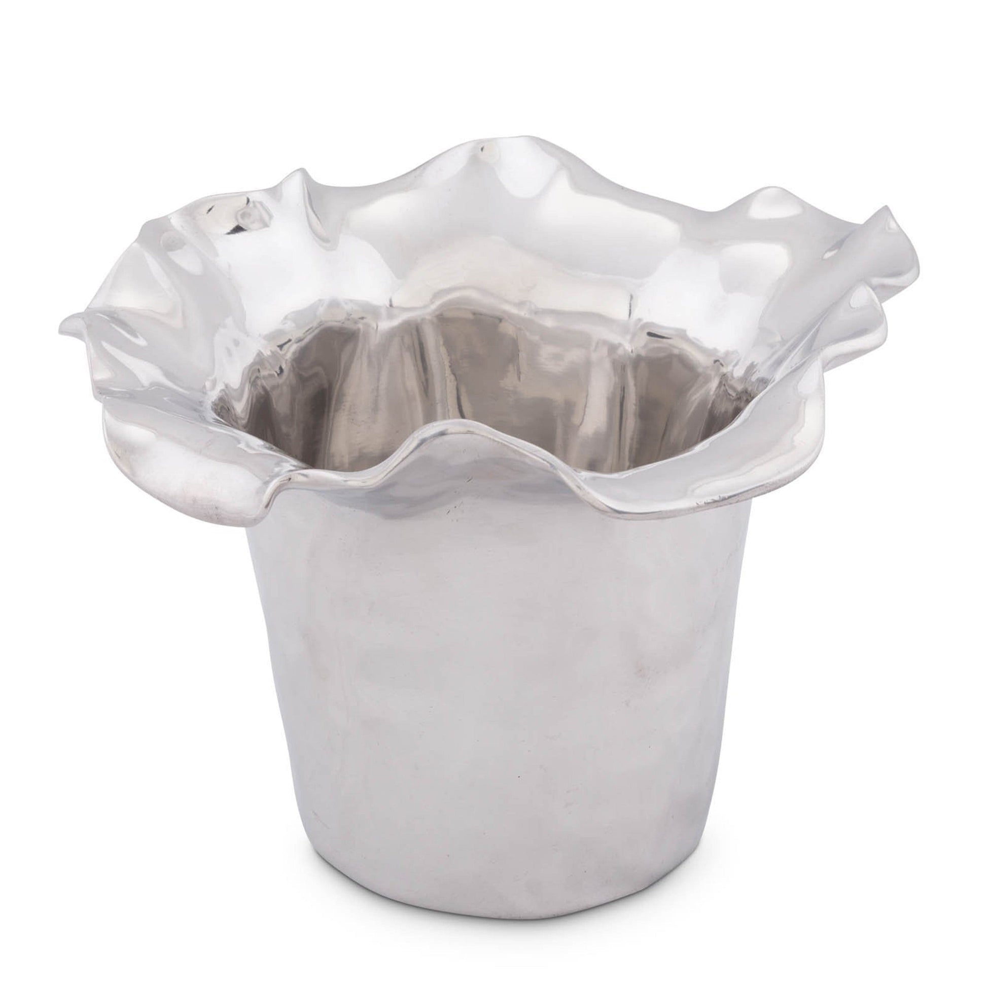 Chill a special bottle in our Carmel ice bucket until the party gets started. This elegant container is handcrafted of lustrous aluminum alloy and molded into a wavy-edged design inspired by the magical village of Carmel-by-the-Sea. Also use as an artistic vase for floral arrangements.