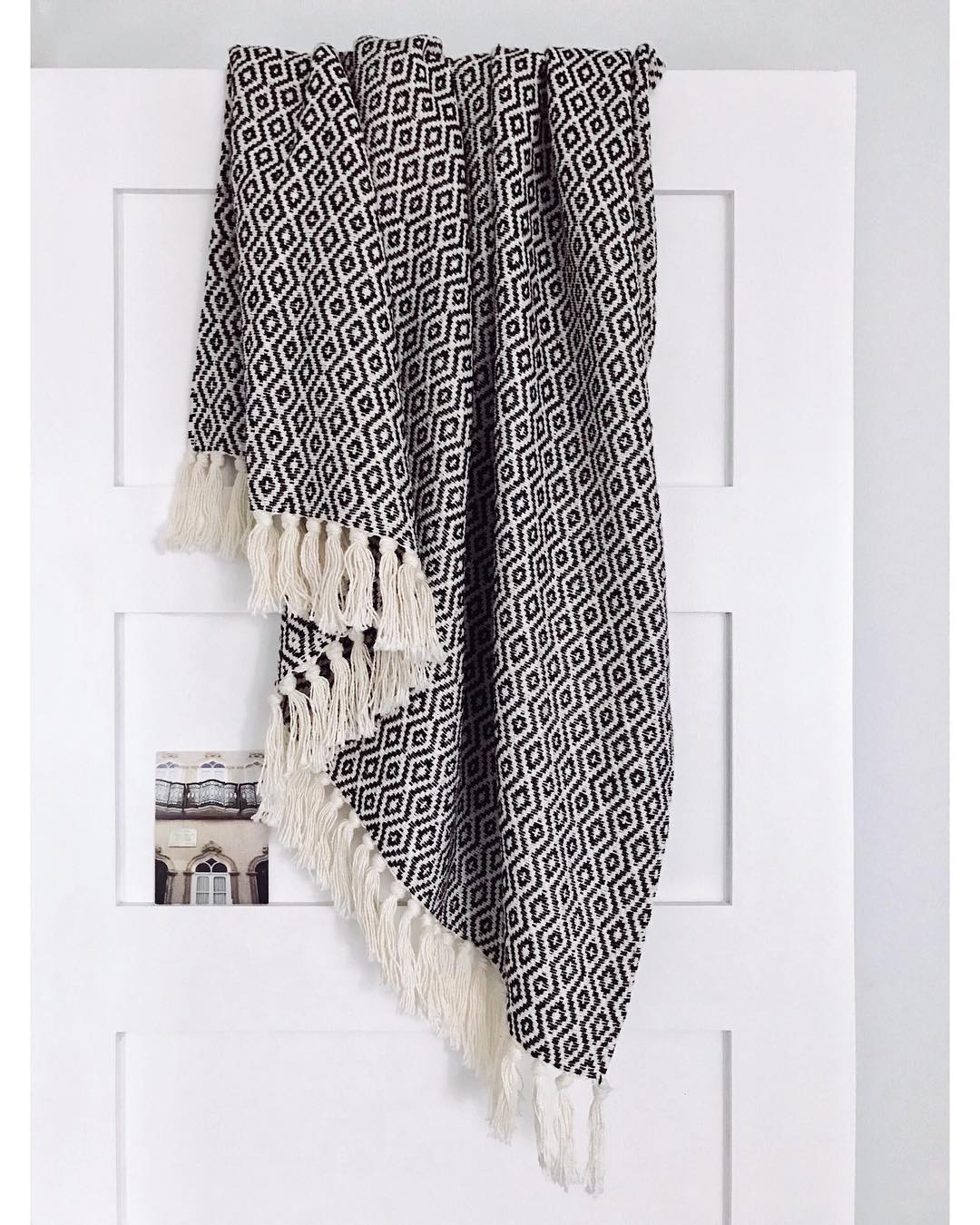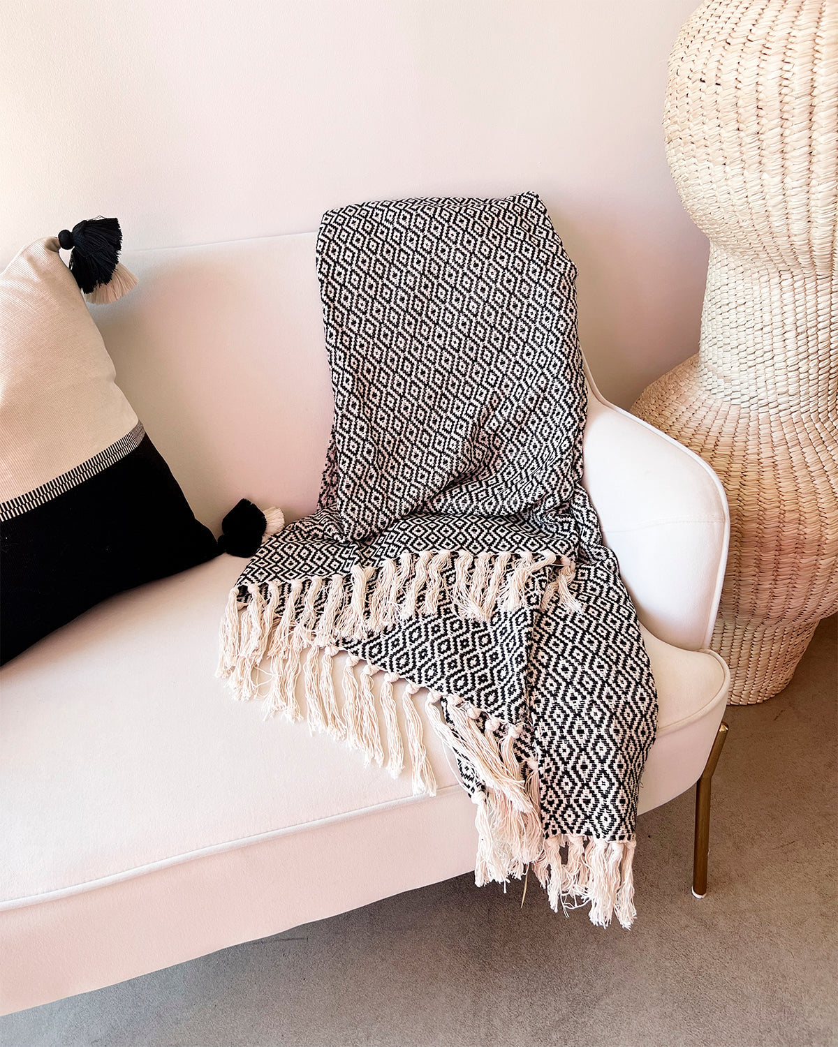 Artisanal Home Decor Throw with Diamond Black and White Pattern and Fringe