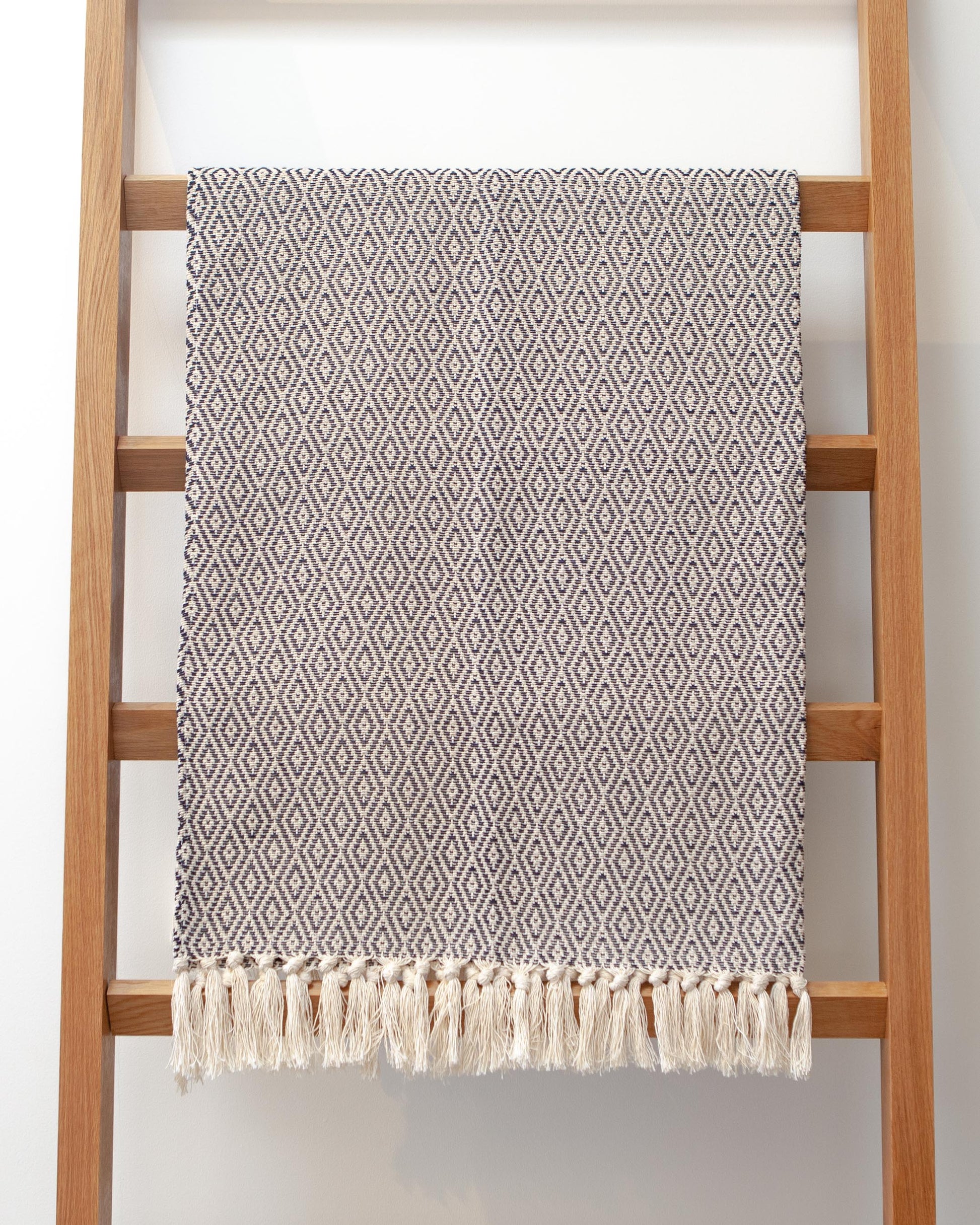 This hand made artisanal throw is made by hand in Southern Portugal. The striking geometric pattern is the perfect graphic addition to any living room. A bold statement while also being timeless. This home decoration blanket goes great with solid color throw pillows to add some dimension and visual interest to your modern couch or boho bed.
