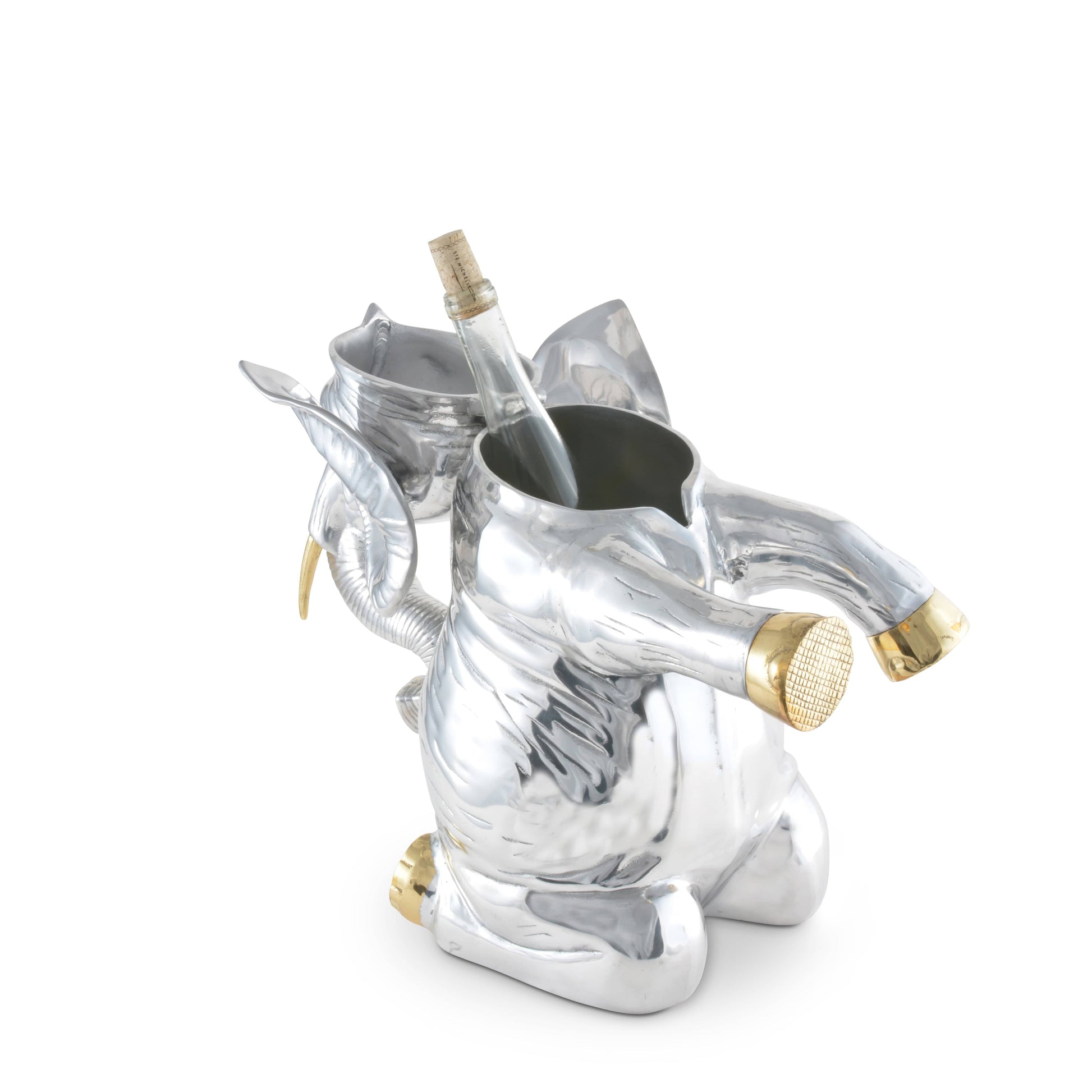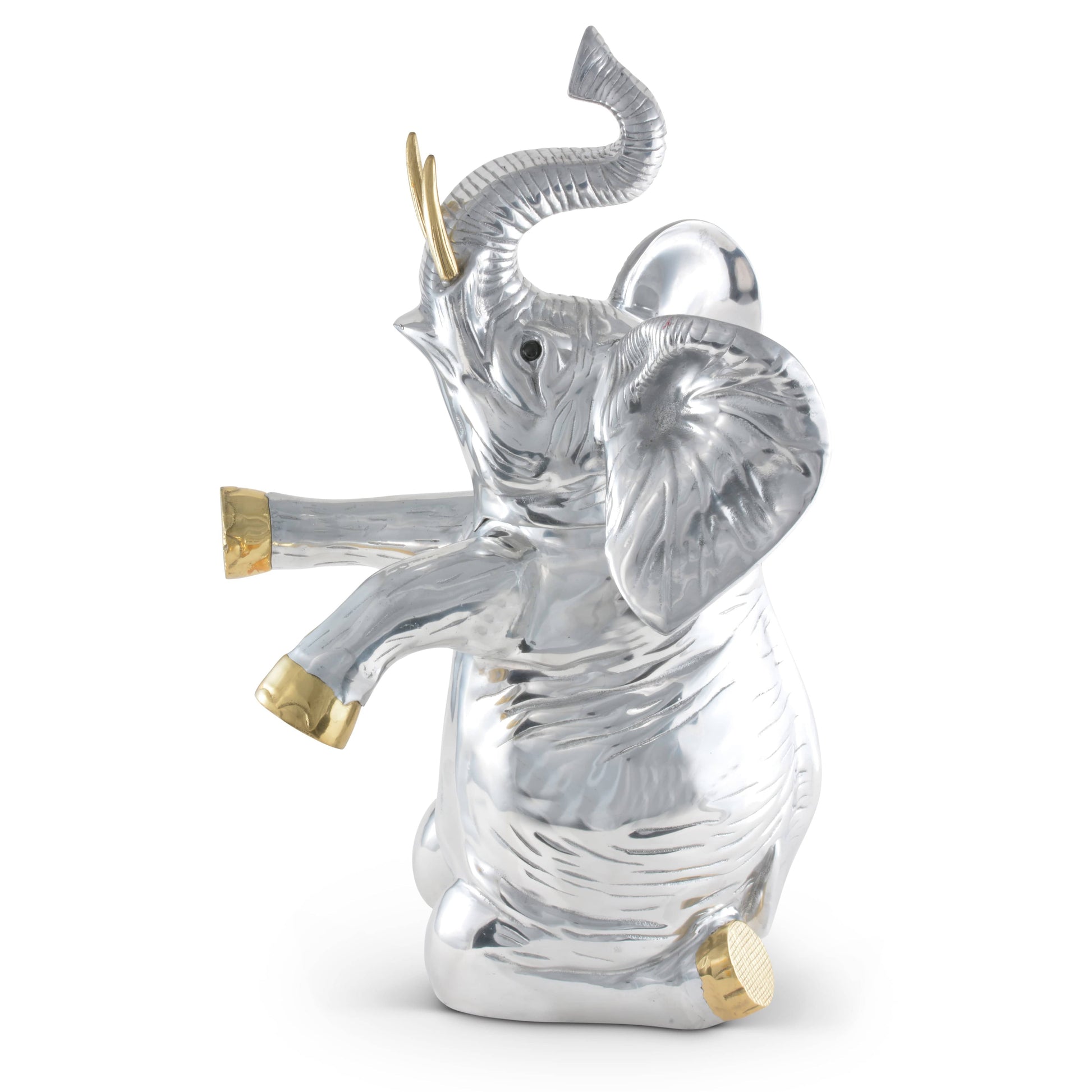 Entertain in style and wow your guests with this Arthur Court Elephant Wine Cooler. This magnificent wine and champagne cooler, shaped like an elephant standing upright, stands 22 inches high when closed, and features a hinge at the base of the neck; opening to a hollow body to house the ice. His eyes are accented by beautiful carnelian gems, and the body is manufactured with Arthur Court's premium signature aluminum alloy, accented with brass. When not in use, this cooler makes a fabulous home accent piece.