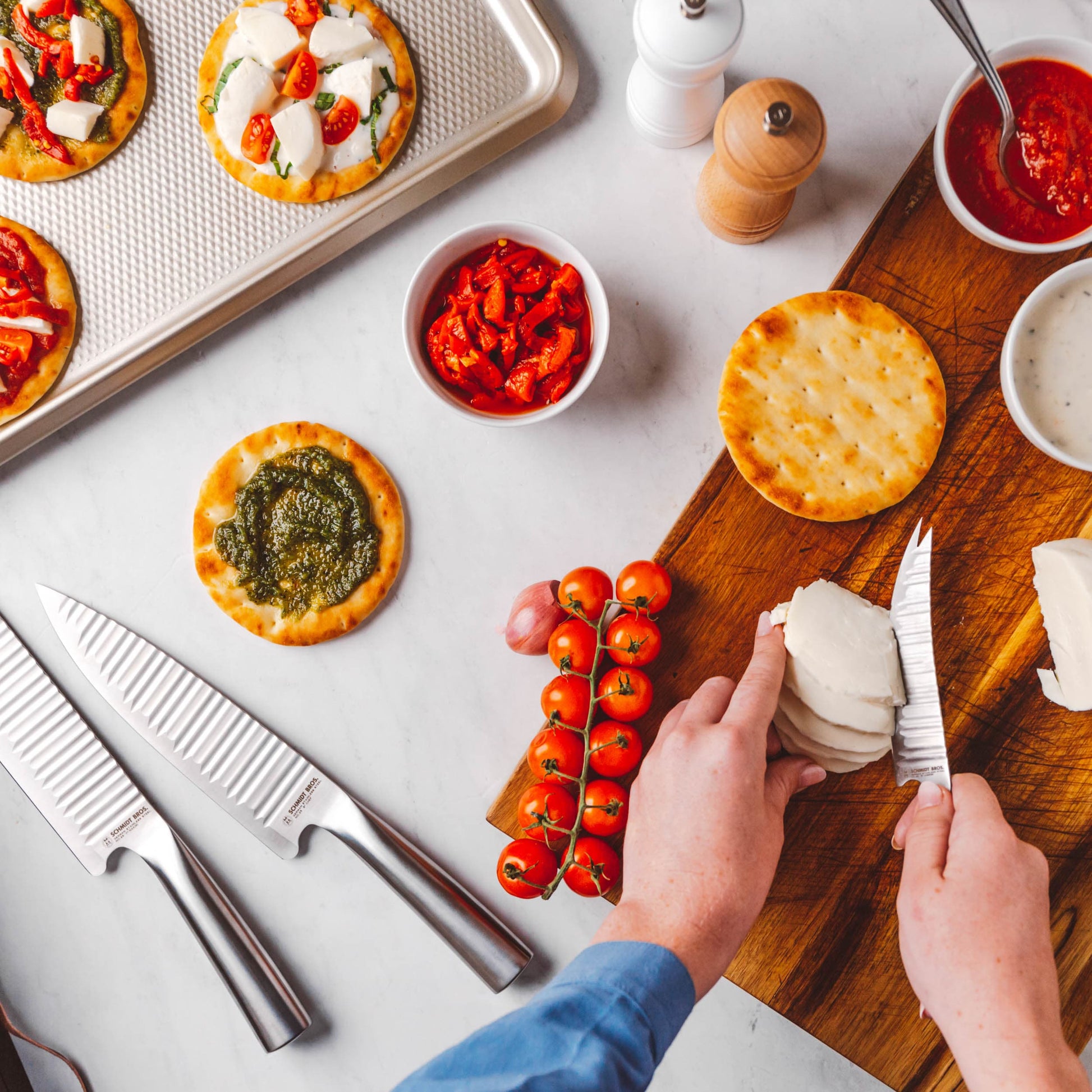 Elevate your cooking with a cutting edge knife that is designed to delight. Forged from premium 100% German Stainless Steel and designed with a grooved blade that reduces friction and pressure in your chopping while still delivering a straight and clean cut. Finished with a natural non-stick blade that’s free of coating or chemicals. The Schmidt Brothers Evolution will deliver a groundbreaking cutting experience whether you’re a home chef or an Iron Chef.