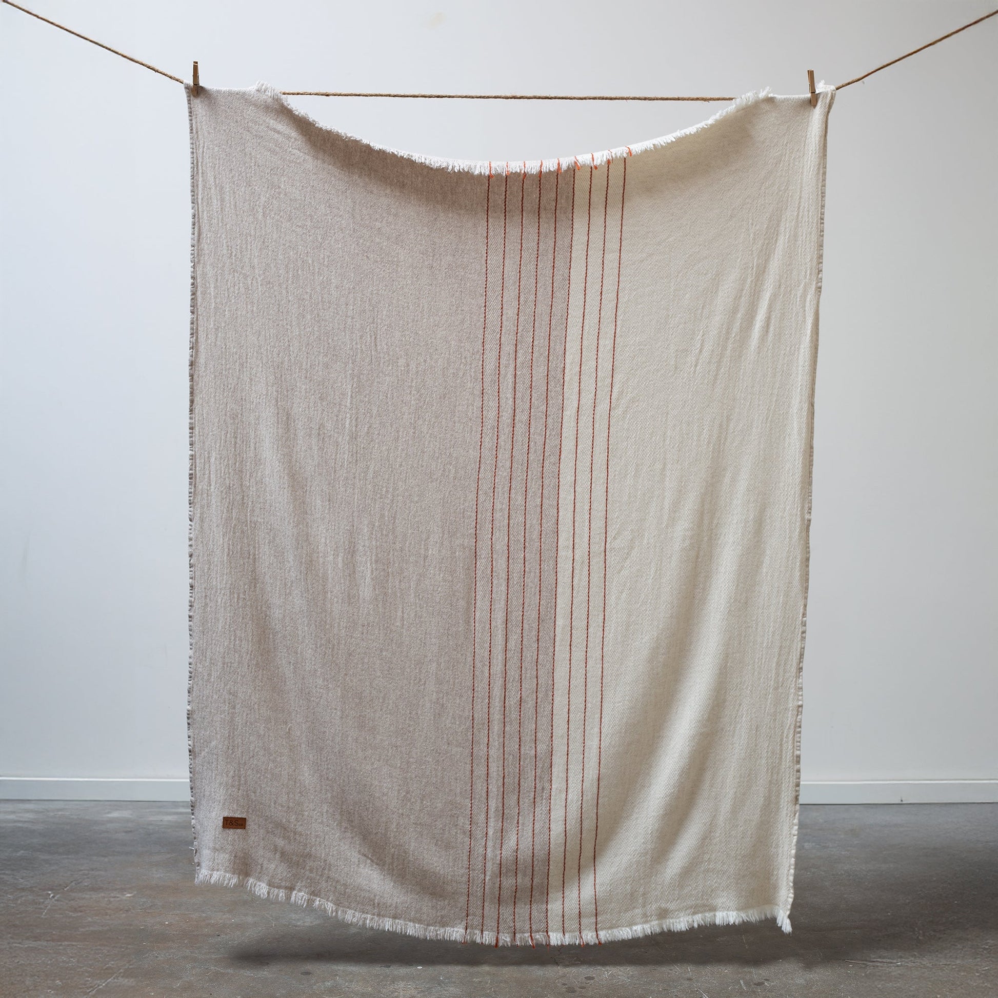 Crafted from a luxurious wool blend, this buttery soft and lush throw offers both style and functionality. Our Horizon throw is woven in elegant cream, beige and rust palette that is earthy and modern. Keep warm and cozy with this elegant throw blanket, perfect for a chilly night in, this throw is a must-have for any home. Made in a small family owned mill near Denizli, Turkey. Dry clean only.