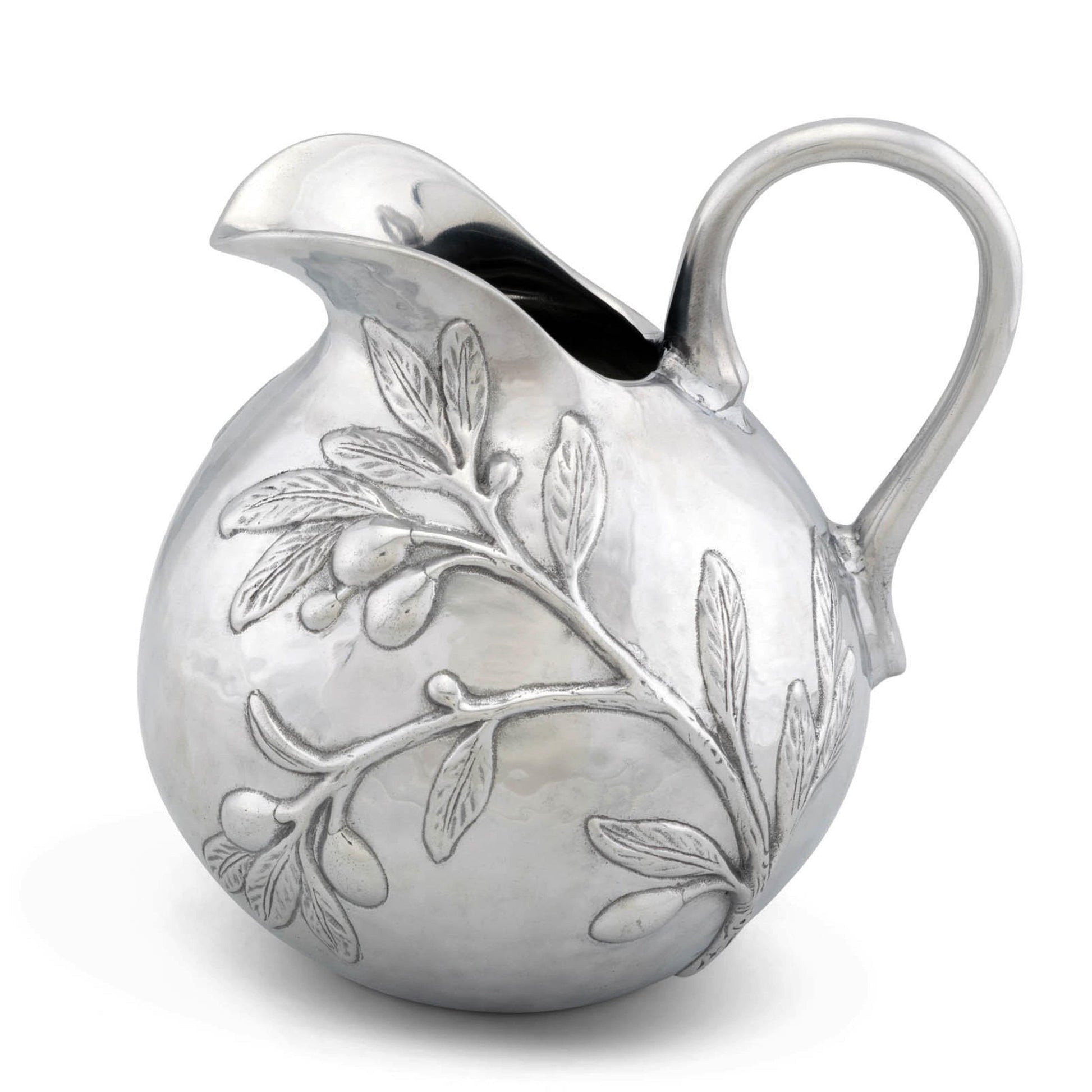 Adorn your table with a symbol of peace when you use this elegant Arthur Court pitcher covered in olive branches with dangling olive fruit. Great for serving iced tea or lemonade for a picnic on the patio. Looking like a giant olive the pitchers round body adds a touch of Tuscany to your home.