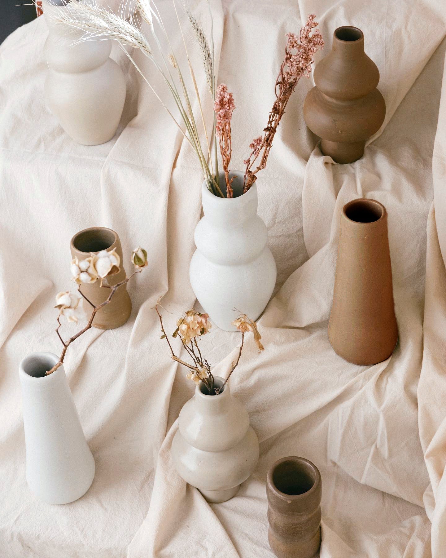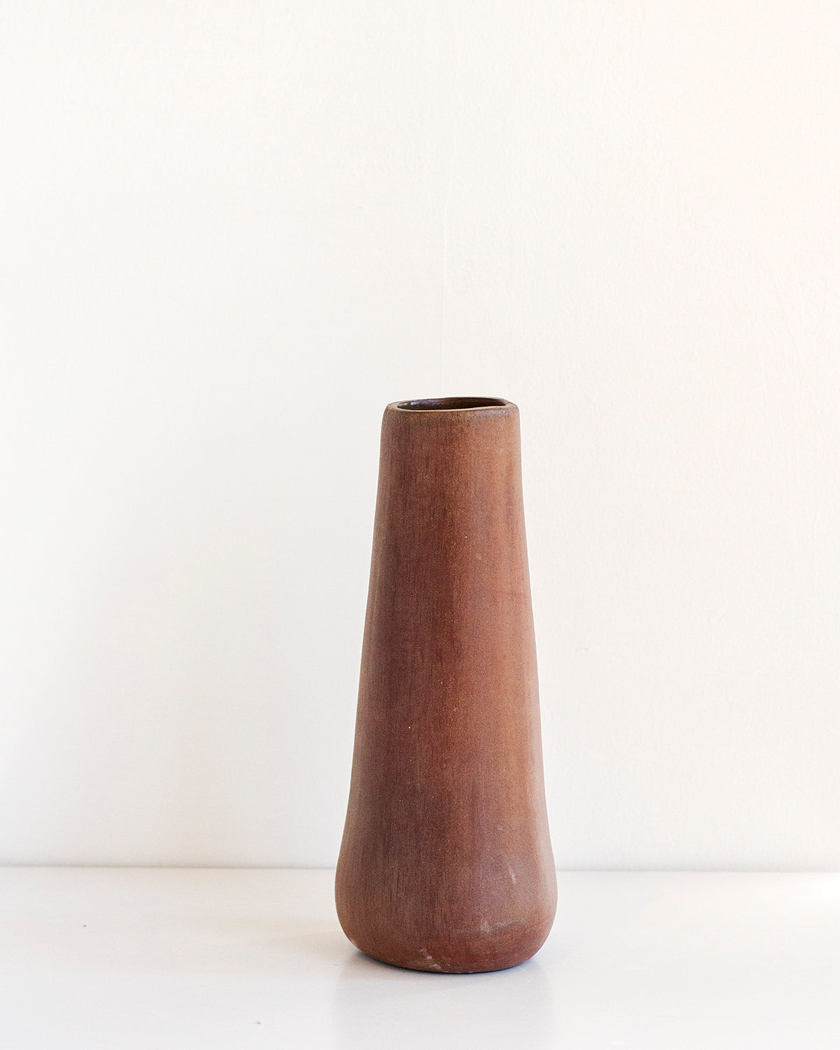 This Solitaire Clay Vase is crafted from toasted clay and is perfect for displaying flowers, branches, or other decorations in minimalist luxury. Its rustic brown hue adds to its quiet elegance, and it makes for an ideal holiday gift. Each piece is uniquely handmade to perfection.