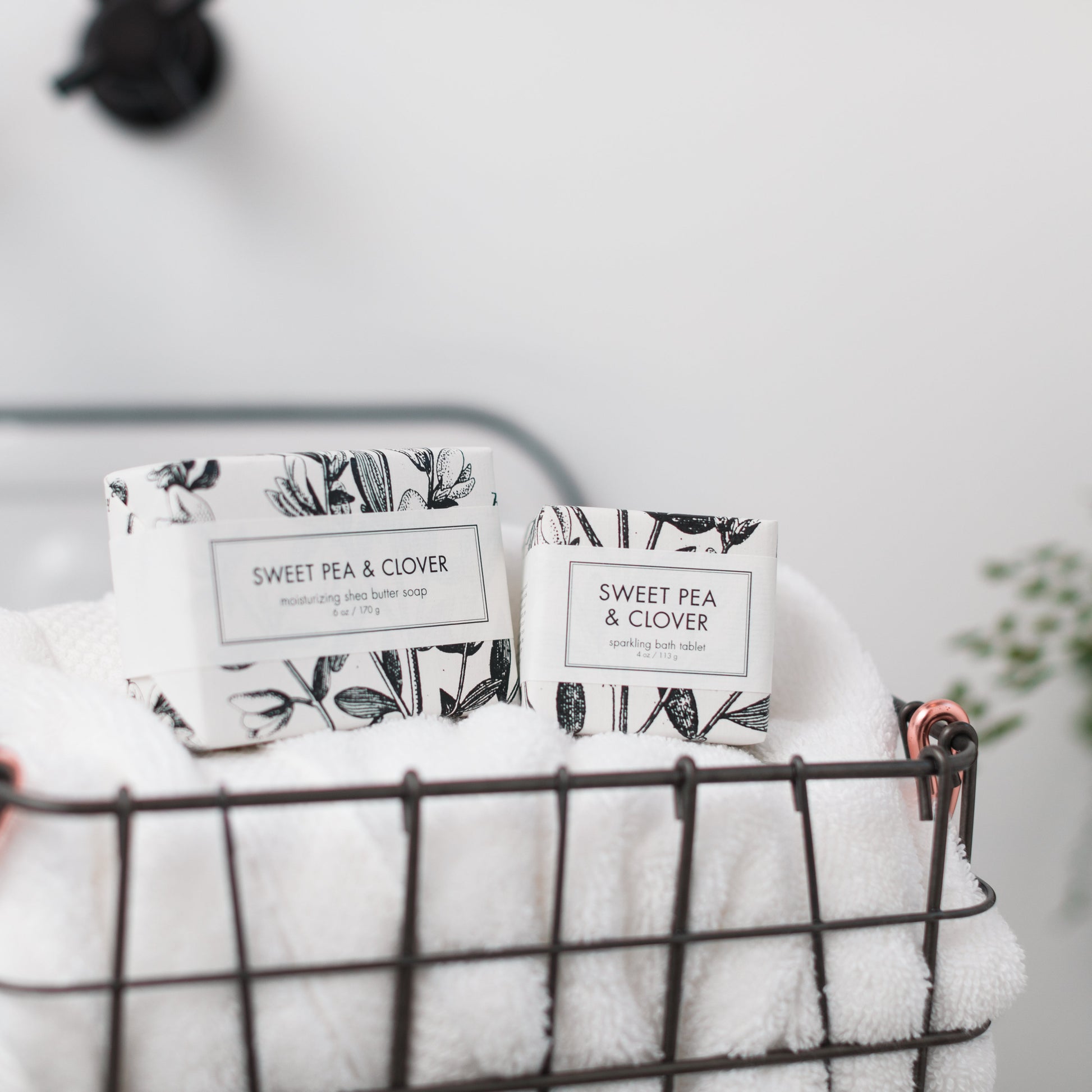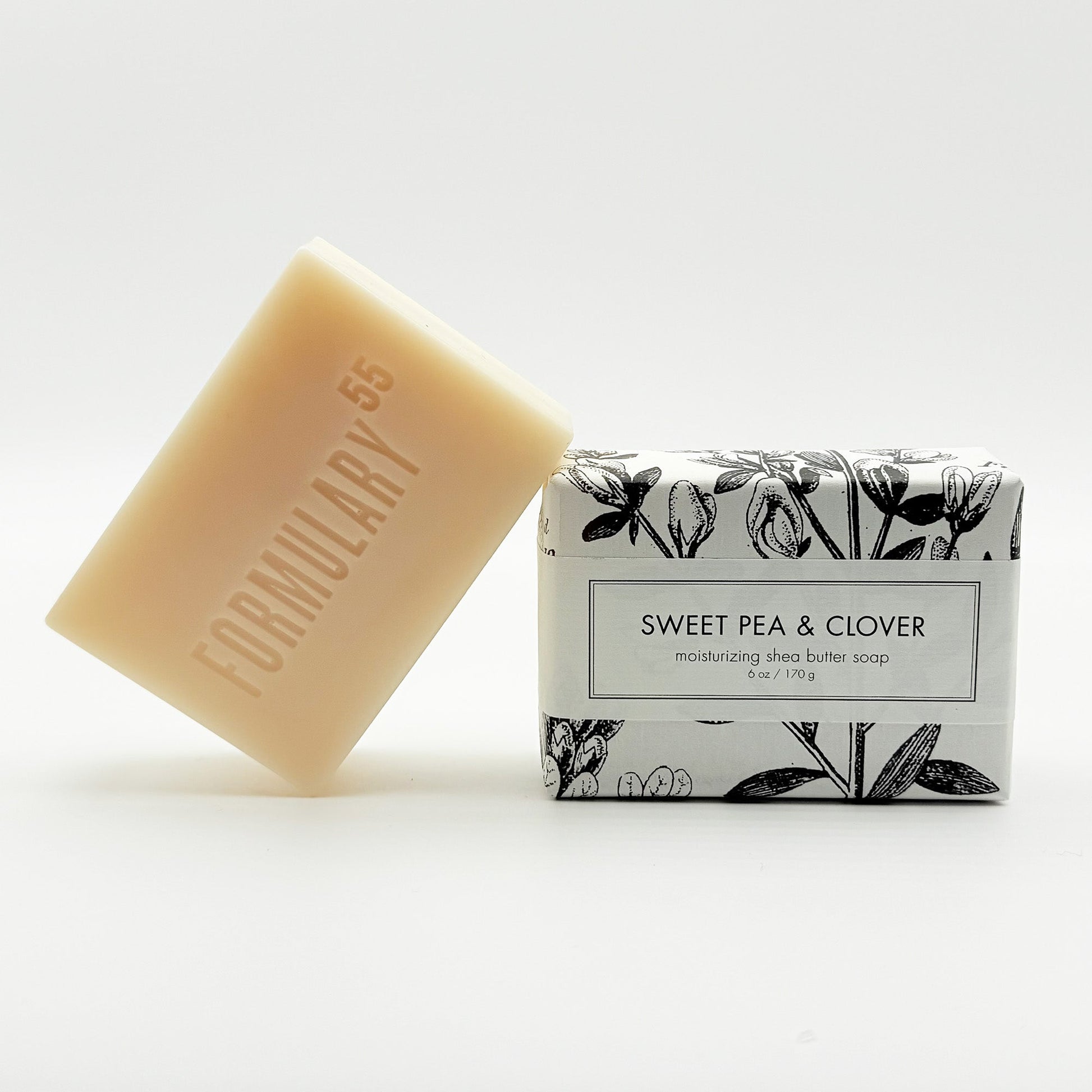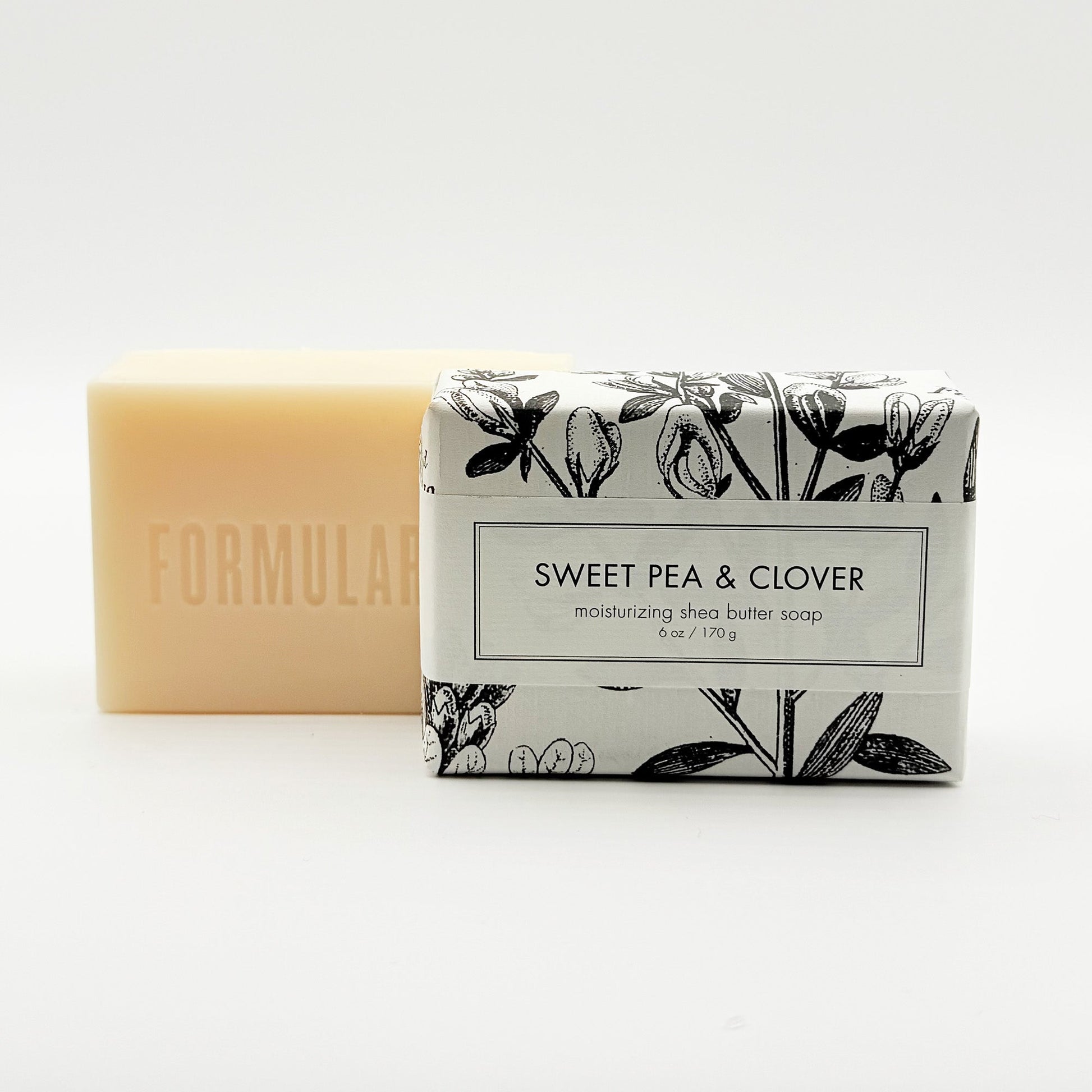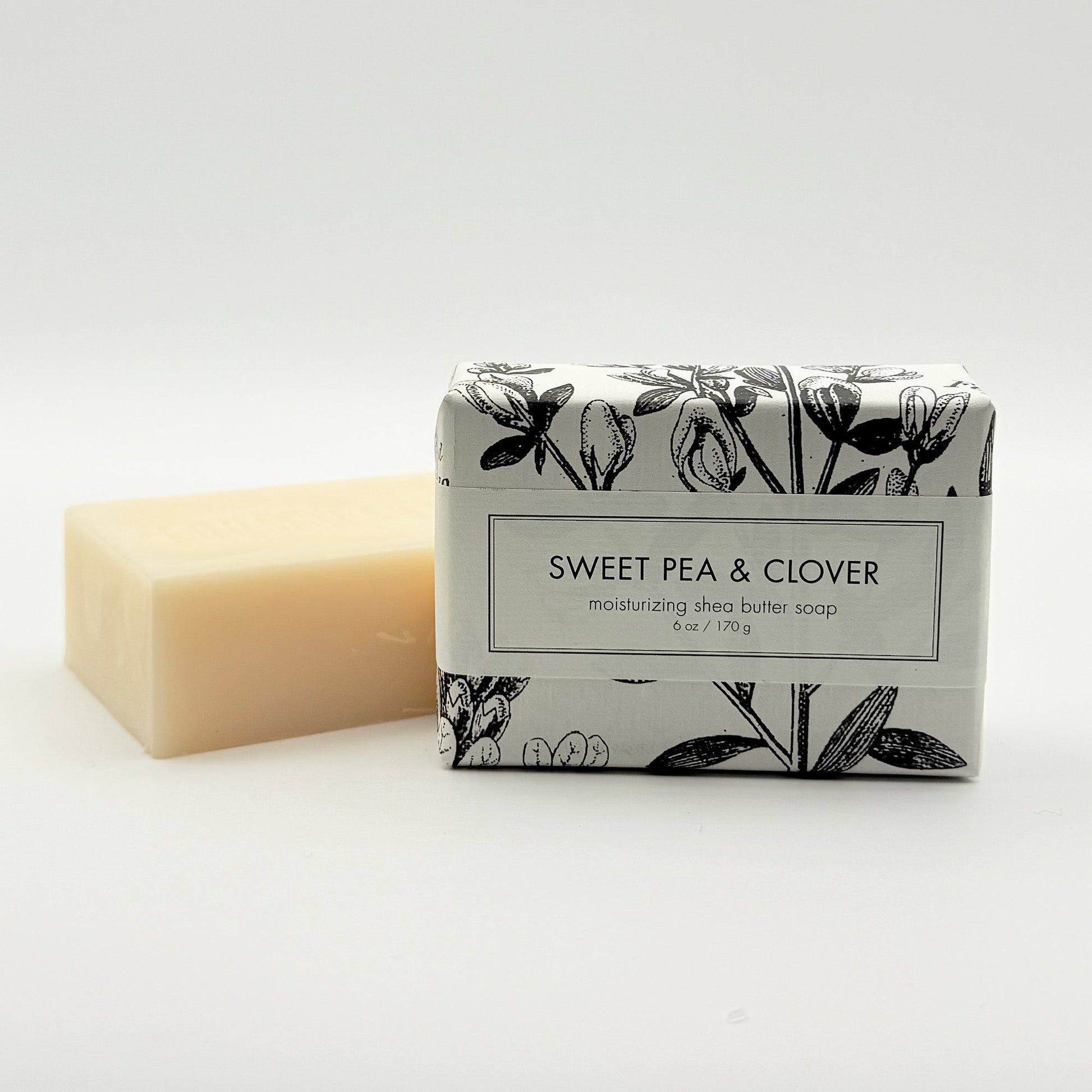 SIZE/DESCRIPTION: 6+oz. Sweet Pea & Clover shea butter bath bar packaged in our signature botanical and vintage illustrations.