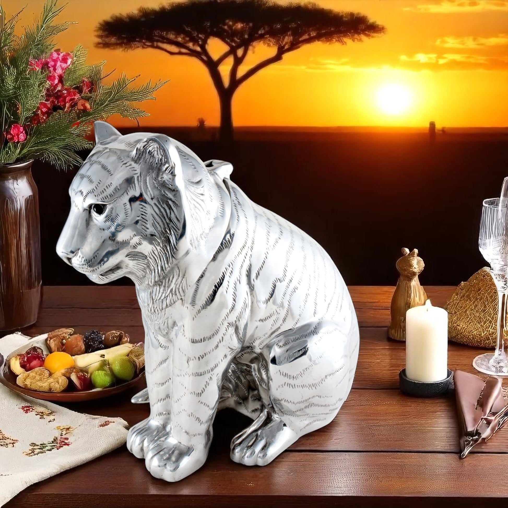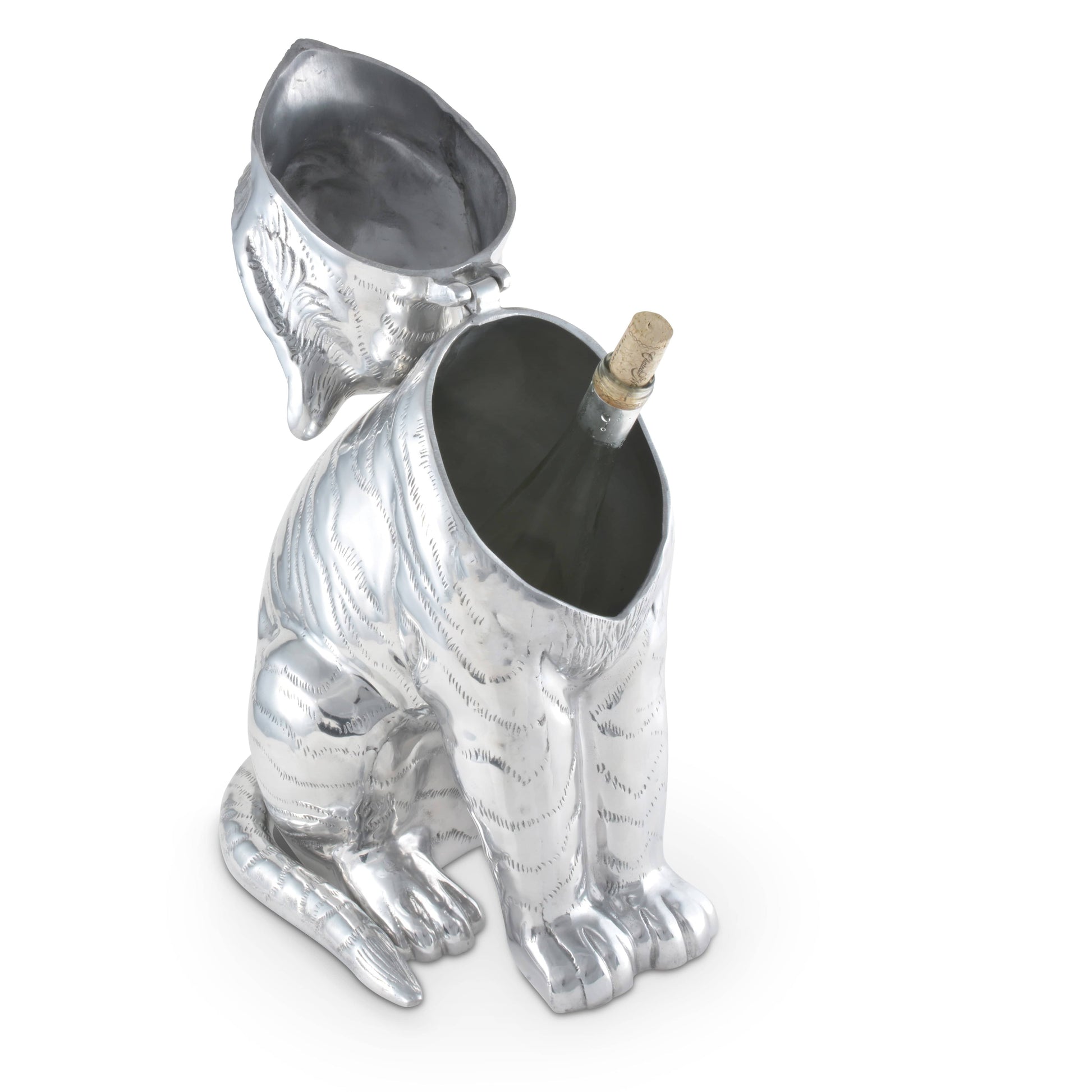 A stoic cat rests on its back legs and observes the night's proceedings with remarkable attentiveness. Realistic detail within its face, paws and patterned fur make you forget there's wine hidden within the hinged neck of this handmade, aluminum tiger.