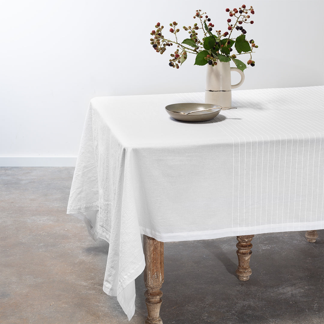 This white linen and cotton tablecloth combines the softness of cotton and the beauty of linen for the best of both worlds. It can be dressed up or down for any season, holiday or just a casual dinner at home.