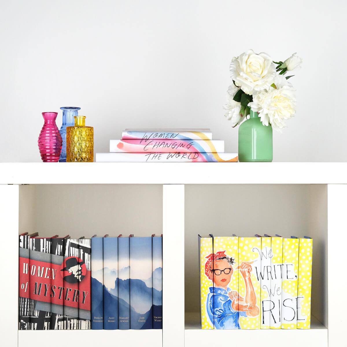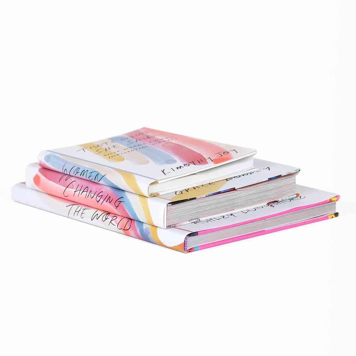 The books in the set are selected from publishers Harper Wave, Artisan, and Rizzoli Books and wrapped in jackets featuring the bold watercolor strokes and hand-lettering of Brooklyn-based artist Samantha Hahn.